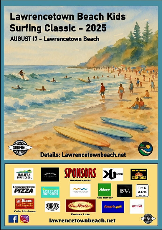 The Lawrencetown Beach Kids Surf Classic event was held on Sunday August 17 2025. Conditions were great! Sunshines, 26 degrees, warm air, 2-3 foot surf, building throughout the day. Light wind in the morning, picked up a bit in the afternoon.